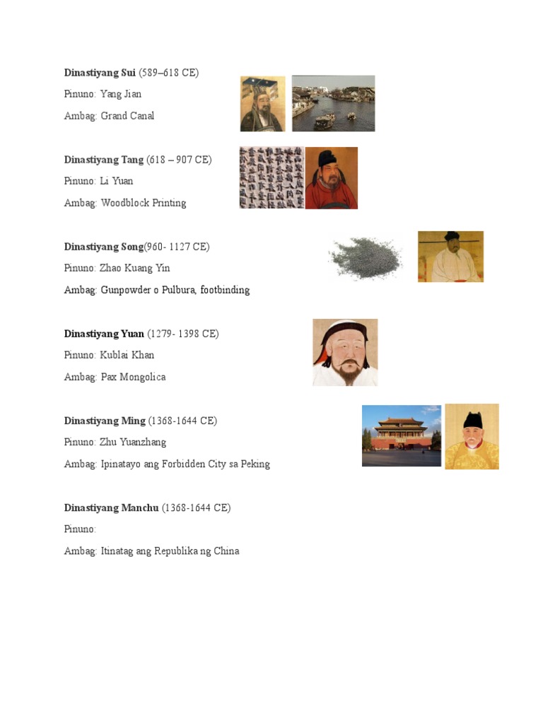 Ambag ng dinastiyang tang. Sa panahong ito naitayo ang Grand Canal. Dinastiyang Ming-nagmula sa rebelyong pinamunuan ni Chu Yuan Chang laban sa mga monggols. - Ang dinastiyang Han ay namuno sa loob ng 400 taon kun saan namayani ang kpayapaan at kaunlaran ng Tsina ng.