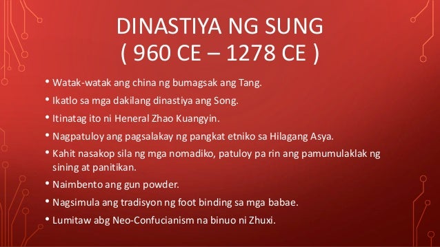 Study Dinastiya Ng China flashcards from Jan Fajardos class online or in Brainscapes iPhone or Android app. Magsimula muna tayo sa pamahalaan. Pamahalaan Ang pamahalaan ng Sung ay nakabase sa timog na bahagi ng Ilog Huang Ho mula 1126 CE hanggang 1279 CE.