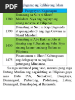Isulat sa talaan ang hinihinging impormasyong tungkol sa paglaganap ng Islam sa Pilipinas. Pahina 31Pangyayaring NaganapTaon1380Pook1450Ika-16 daan. Itinayo niya ang unang Masjid mosque sa Pilipinas sa lugar ng Tubig-Indangan sa pulo ng Simunol.