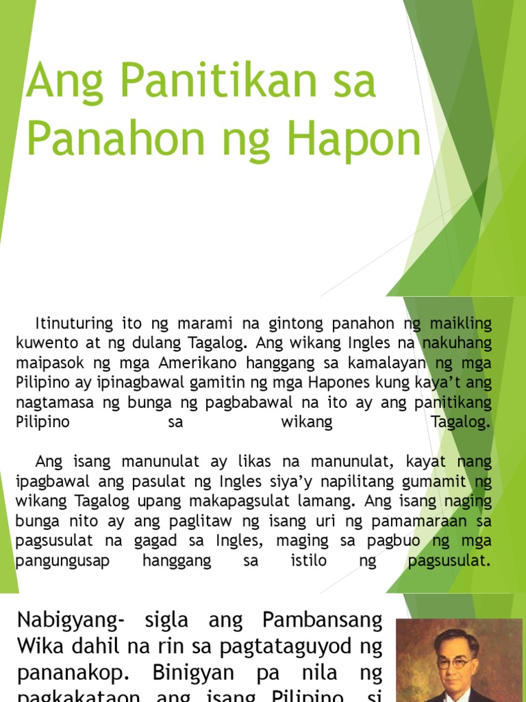 Pananakop ng mga Hapon Lance Gerárd Gonzaléz Abalos BSE. PANITIKAN SA PANAHON NG HAPON Pagbabago PAGSAKOP URI NG PANITIKAN PAGBABAGO EPEKTO NG MGA ITO Ika-8 Disyembre 1941 - Pagsabog ng Pearl Harbor sa Hawaiiat ng Clark Air Base sa Pampanga Pagsakop sa Maynila Ika-3 Enero 1942 - Pagtatag ng Batas Militar sa Bansa Ika-9 Abril 1942 -. 2 on a question Mahalagang pangyayari sa panahon ng hapones.